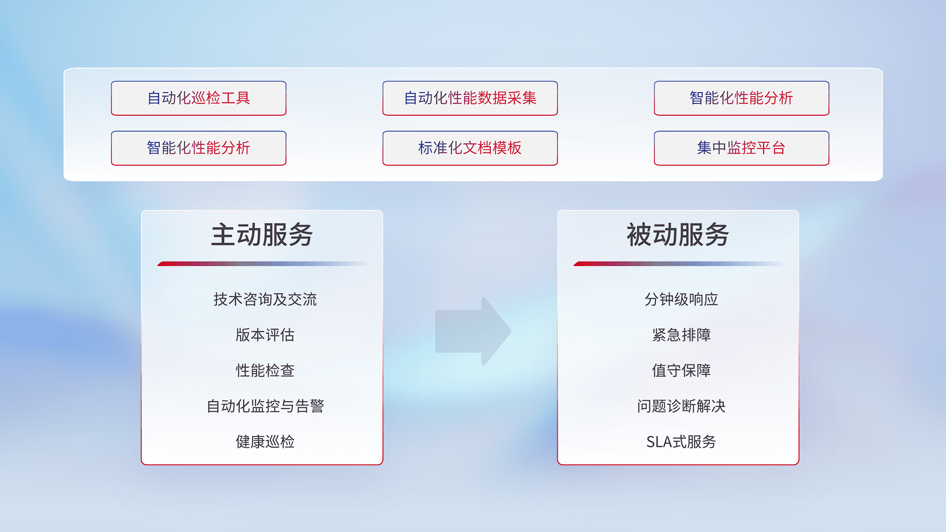 智能化工具和标准化文档,,保障服务质量,,,提供主动服务(包含技术咨询、、版本评估、、性能检查、、、、自动化监控与告警、、、健康巡检)和被动服务包含(分钟级响应、、紧急排障、、值守保障、、、、问题诊断解决、、SLA服务)。。。